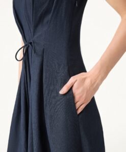 Viscose-Linen Collared V-neck Midi Dress with Drawstring