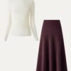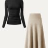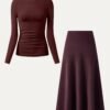 2Pcs Set Ruched Sides Tuckable Mockneck Top & Flared Maxi Skirt