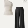 2Pcs Set Sandwashed Ruched Brami & Mid Rise Wide Leg Palazzo Pants with Pockets