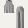 2Pcs Set Split Hem Top & High Waisted Straight Leg Pant