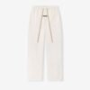The Women’s Lounge Sweatpant is crafted from 480gsm core fleece and cut in a voluminous wide-leg fit to emphasize drape and movement. Finishing details include an encased elastic waistband with elongated drawcords, side seam pockets, and a Fear of God Essentials label stitched at the center front.