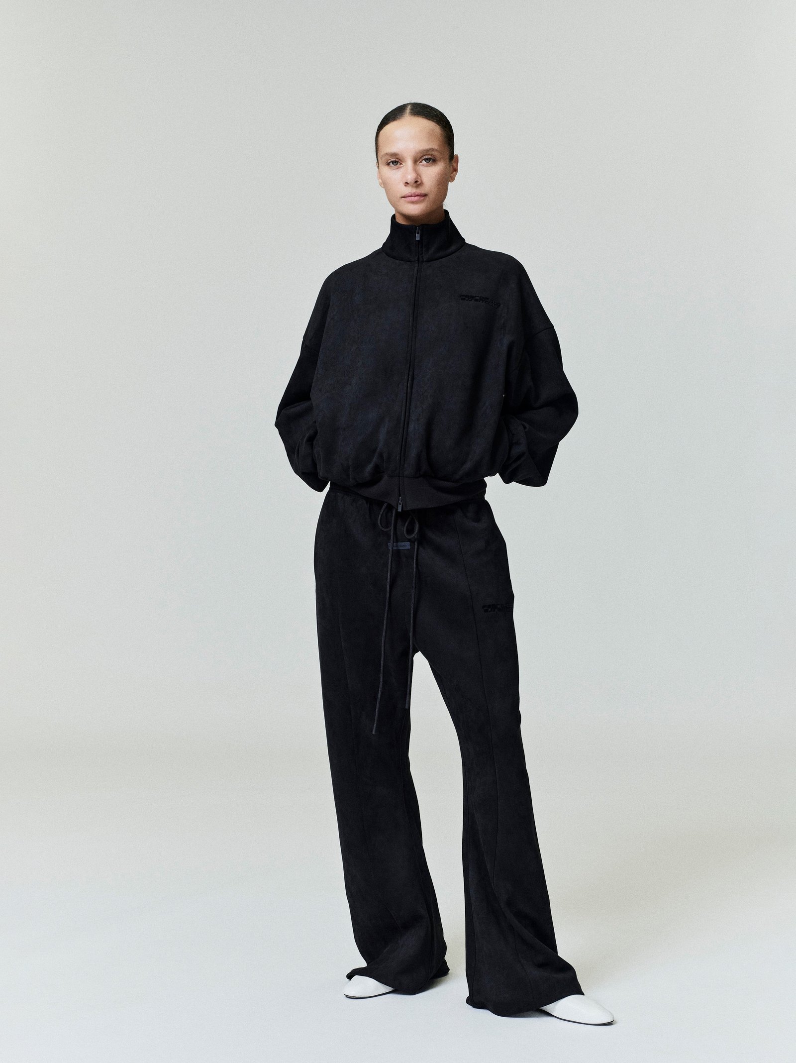 The Women’s Vintage Track Jacket is crafted from bonded suede fleece, offering a plush, suede-like hand feel that complements the vintage fit. The piece is detailed with a high neck, full zip front, rib-knit cuffs and waist hem. A Fear of God Essentials rubberized label stitched at the back.